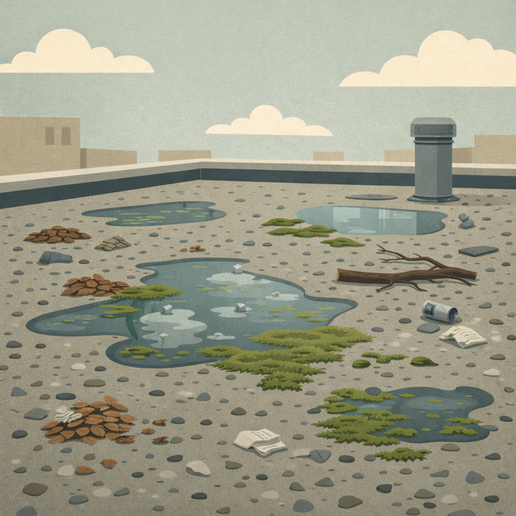 Water that remains on the roof for extended periods can lead to serious issues, including membrane damage, leaks, and structural weakening.